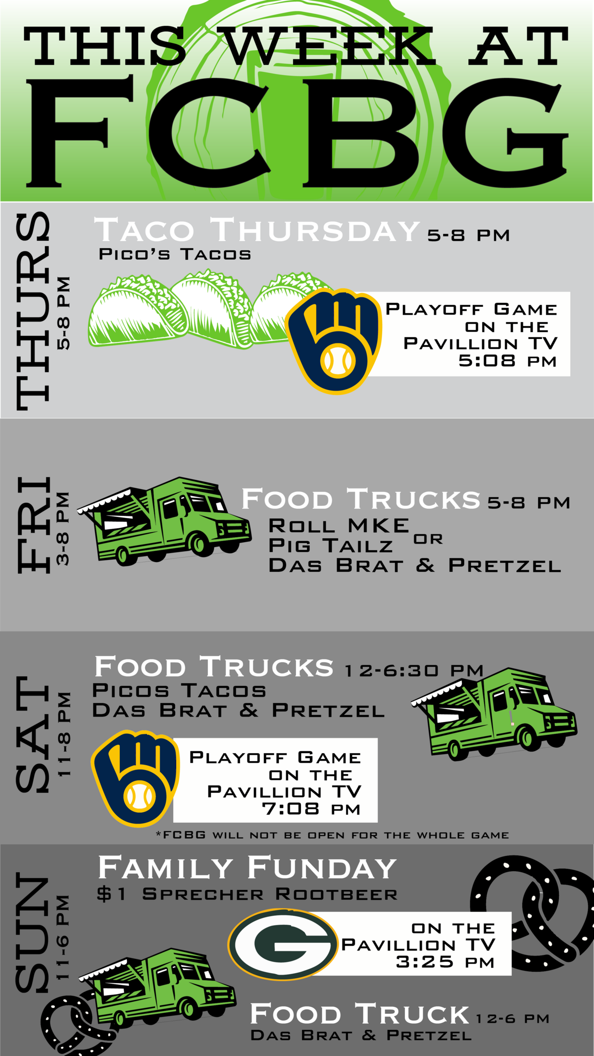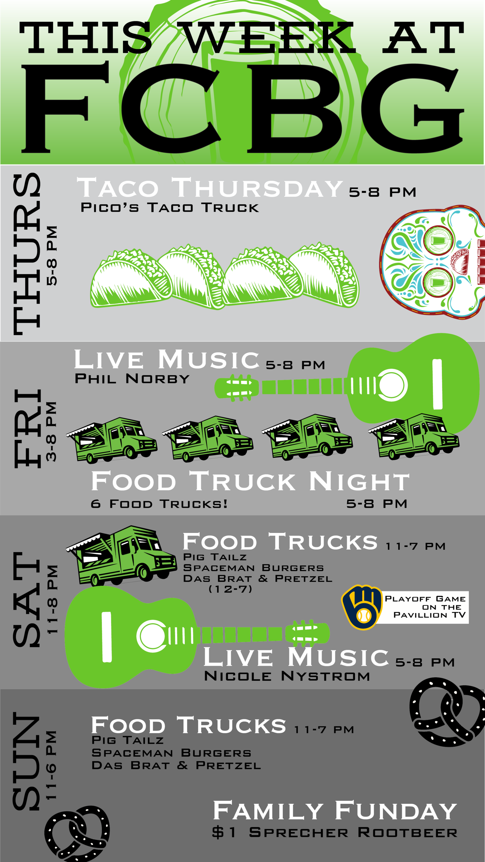 You'll find a rotation of 16 to 26 Wisconsin Craft Beers on tap, cider, seltzer, wine and the areas best food trucks changing it up each day. On Fridays & Saturdays, you'll find our award-wining and free Live Music Series. We host the best of summer and fall in a relaxed, family-friendly atmosphere.